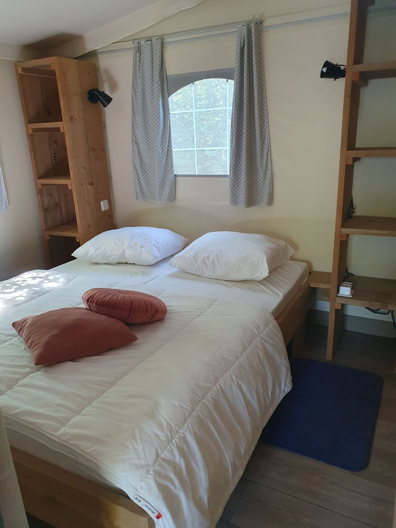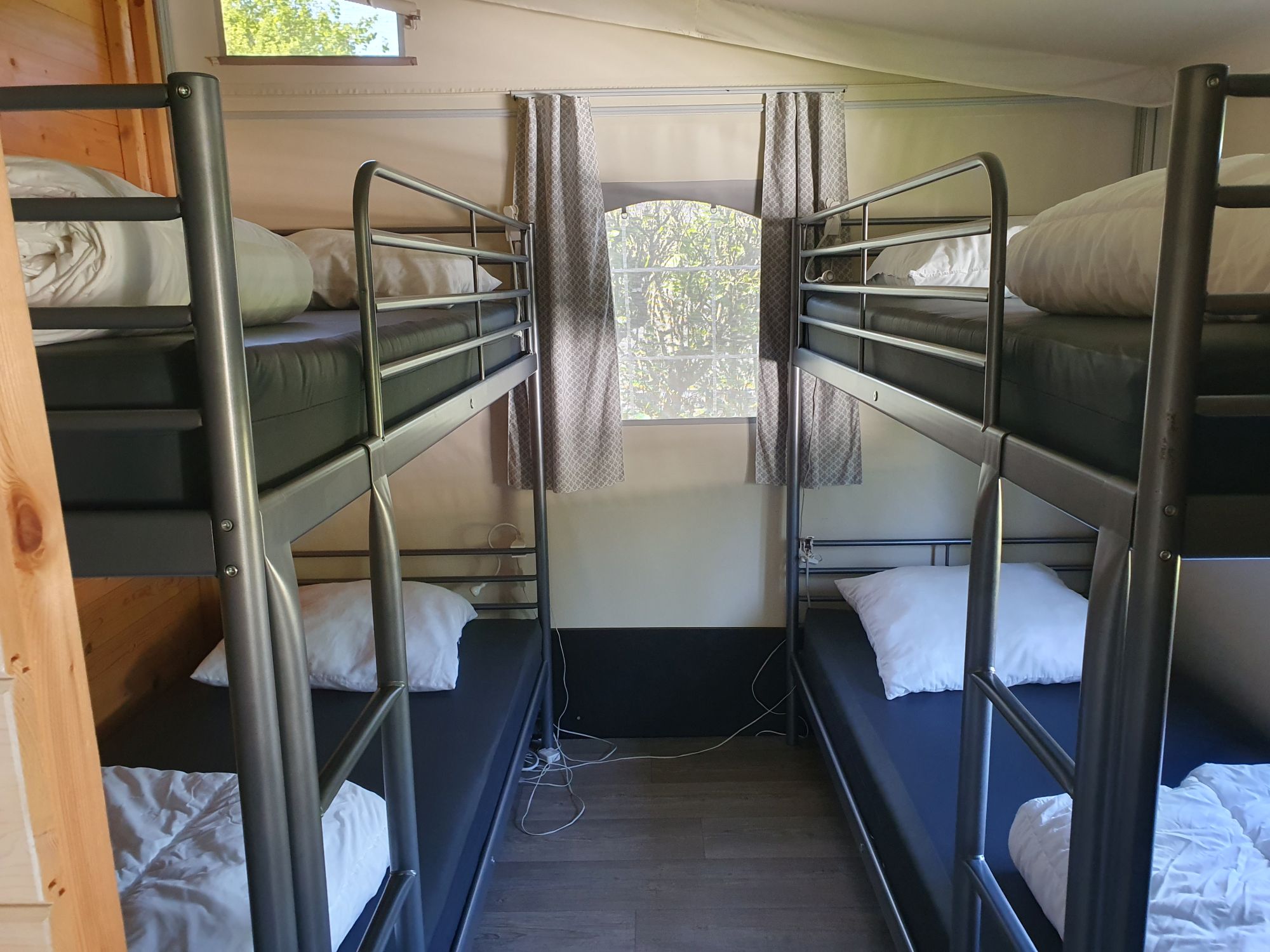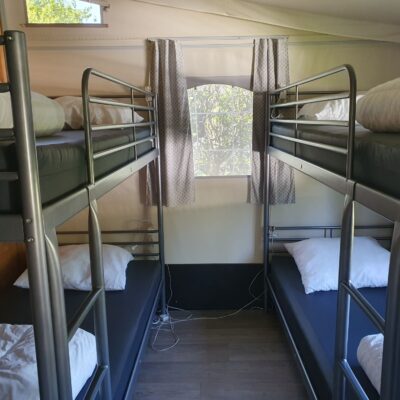 De 6 persoons lodgetenten (plaats 56, 57 en 63) zijn 30.25 m2 en beschikken over 2 slaapkamers: 1 slaapkamer met een 2-persoonsbed en 1 slaapkamer met 2 stapelbedden.