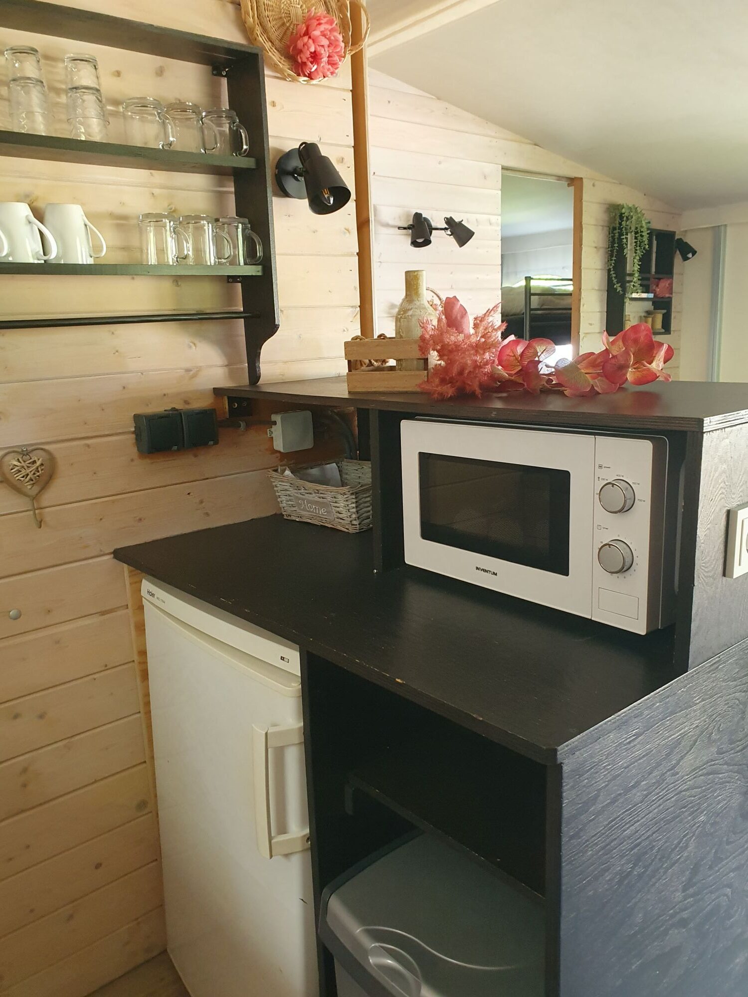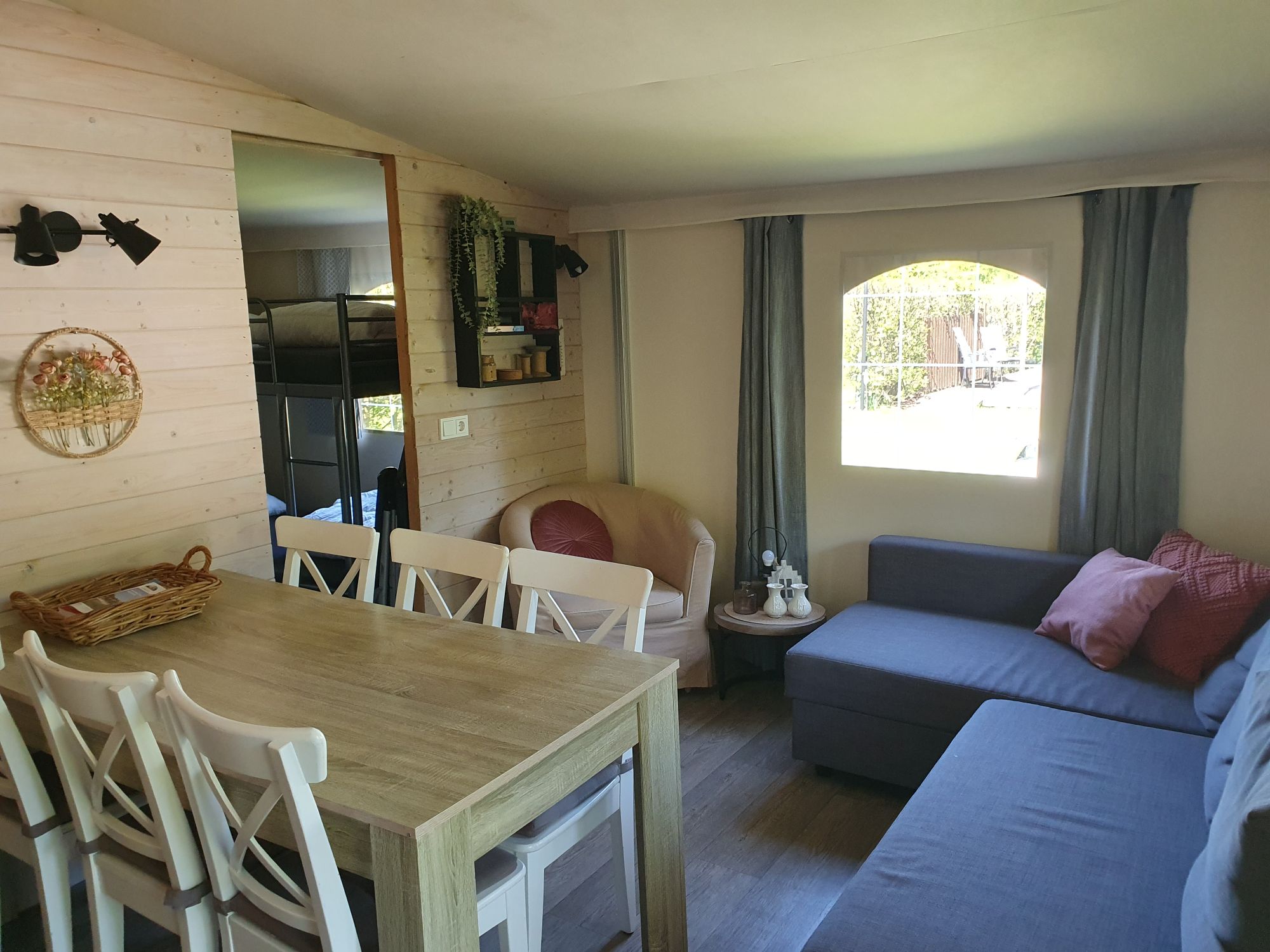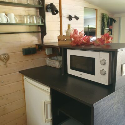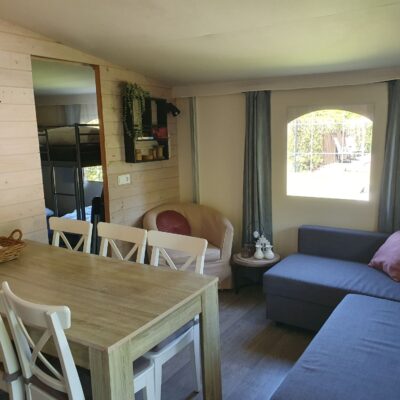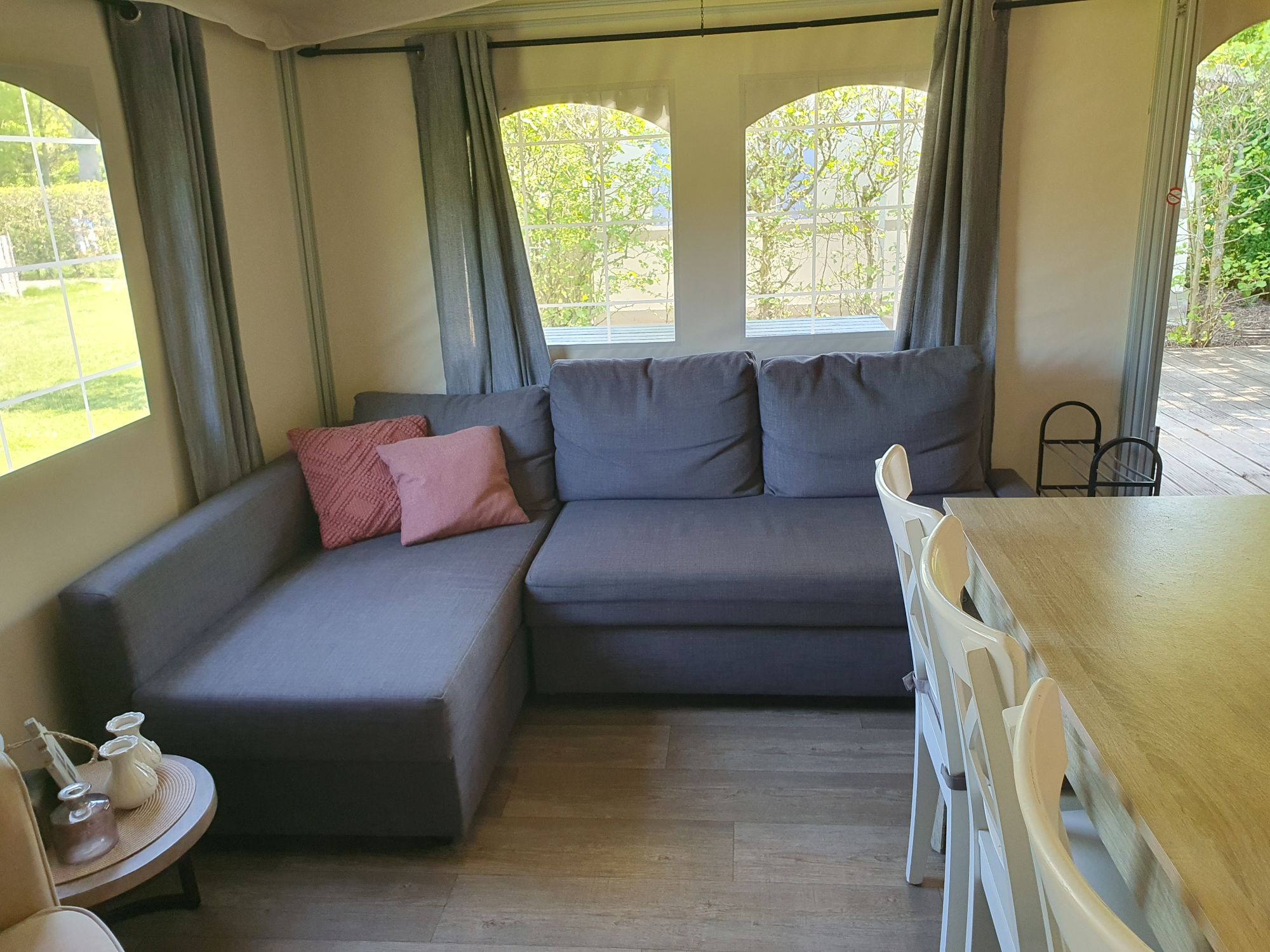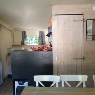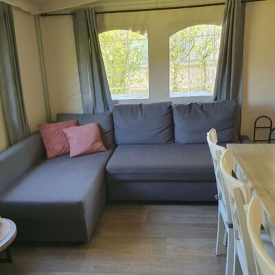 De bank in het woongedeelte kan omgebouwd worden tot een 2-persoonsbed, voor extra slaapplaatsen.