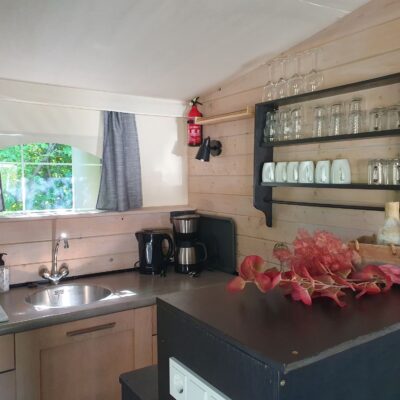 Verder is er een keukenblok met een koelkast met vriesvak, een vierpits-gasstel, koffiezetapparaat en waterkoker. De lodgetenten beschikken over een eigen douche en toilet. De lodgetenten hebben een overdekte veranda om ook buiten te kunnen genieten.